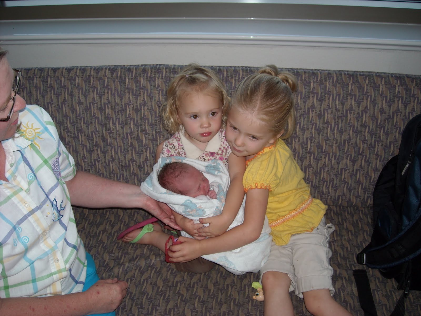 Emmett Thomas Petroff was born on Friday August 13, 2010. He weighed 5 pounds 14 ounces and 18 inches long. Look at his beautiful dark hair! Straight not curly. Third child of Thomas and Elise Petroff. Pround grandparents are Bob and Sandra Petroff and Jane and Eric Larsen. The top picture we have Olivia and Savannah holding Emmett with Grandma helping. Then we have the happy family together. Tom and Elise, Emmett, Savannah and Olivia. Christina got to come from work on her break to see the exciting arrival of Emmett with Olivia and Savannah. Bob is holding Emmett on the SECOND day. He doesn't look as red now. Sandra is happy to be holding her new bundle of joy.